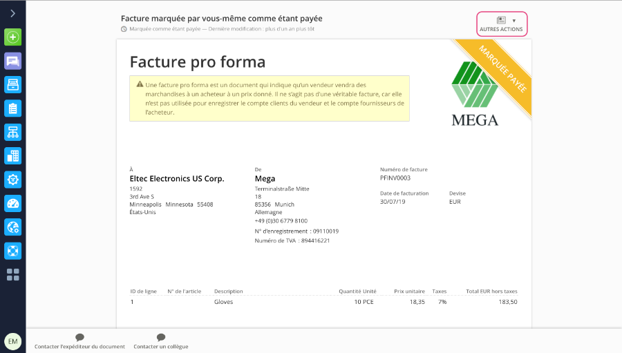 Quelques jours plus tard, le destinataire règle la facture par virement bancaire. Ensuite, il accède au document et lui affecte l’état Payé